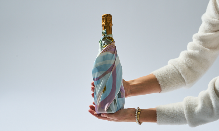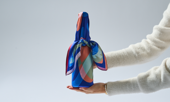 The perfect gift for the host, a bottle of wine wrapped in a furoshiki wrap makes for a great party trick.